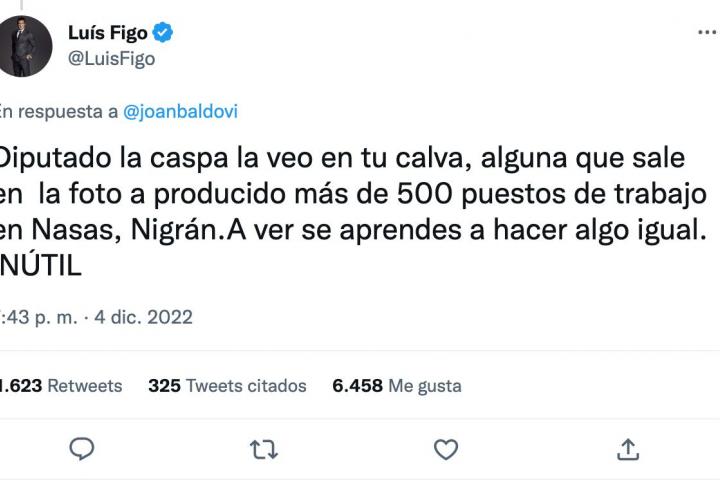 “La caspa”, puso el político valenciano y futuro candidato por Compromís a presidir la Generalitat Valenciana. Un tuit muy comentado y que ha levantado polvareda en Twitter, donde ha respondido el propio Figo, que ha llamado “inútil” en mayúsculas a Baldoví.