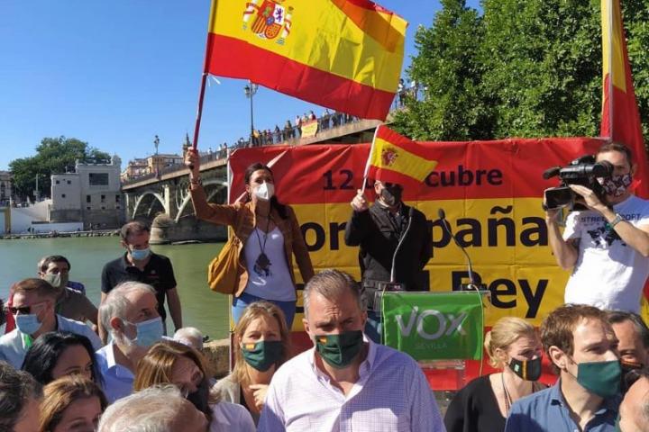 La bandera desplegada por el partido de ultraderecha bajo el puente de Isabel II en Sevilla -popularmente conocido como el puente de Triana-, llevaba otra frase: “Por España con el Rey”.