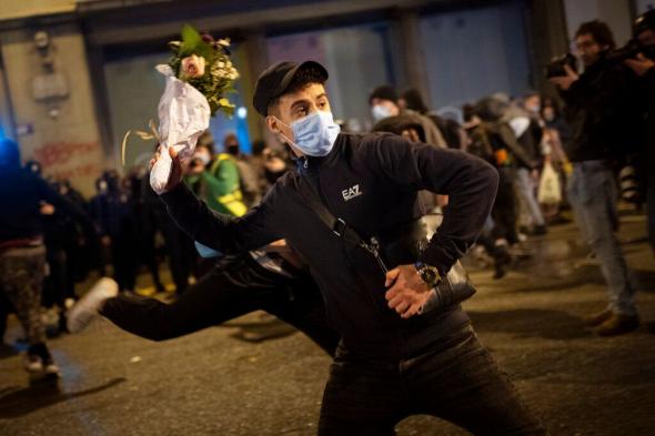 La estampa se vio anoche en Barcelona, en la séptima noche de disturbios por el arresto y encarcelamiento del rapero Pablo Hasél, y la captó el fotoperiodista de la agencia AP Emilio Morenatti. Todo un icono hecho carne, el de la obra “Rage, the Flower Thrower”, pintada en 2005 por el británico.