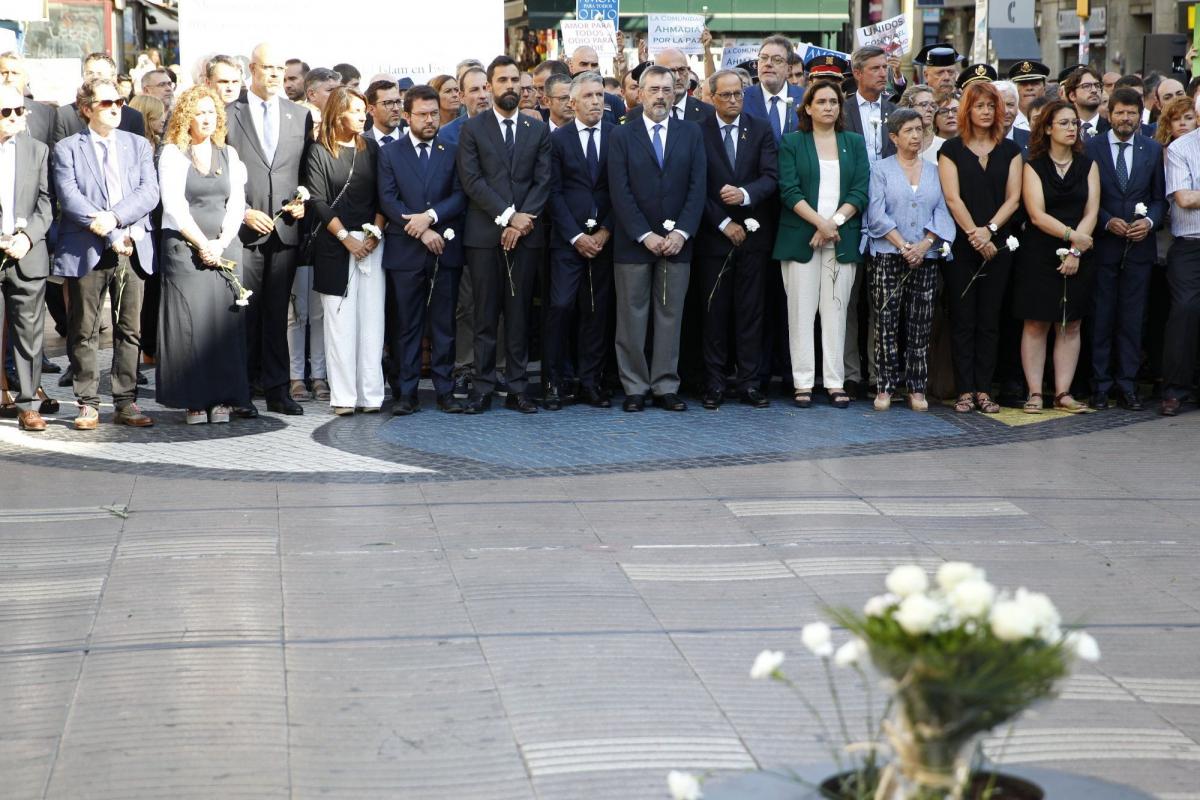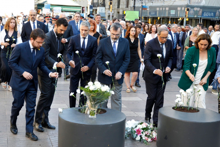 Al acto institucional para conmemorar el segundo aniversario de los atentados del 17-A han asistido, entre otros, familiares de las víctimas, el presidente de la Generalitat, Quim Torra; el ministro de Interior, Fernando Grande-Marlaska; y la alcaldesa de Barcelona, Ada Colau; además de mandos de los Mossos d’Esquadra, la Policía Nacional, la Guardia Civil y la Guardia Urbana de Barcelona.