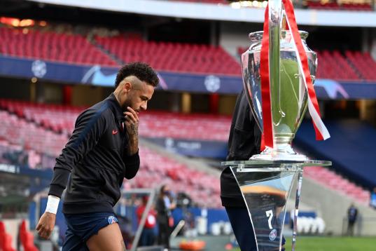 LISBON, PORTUGAL - AUGUST 23: In this handout image provided by UEFA, Neymar of Paris Saint-Germain walks past the Champions League Trop during the UEFA Champions League Final match between Paris Saint-Germain and Bayern Munich at Estadio do Spo...