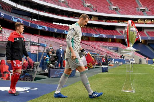 LISBON, PORTUGAL - AUGUST 23: In this handout image provided by UEFA, Manuel Neuer of FC Bayern Munich leads his team out prior to the UEFA Champions League Final match between Paris Saint-Germain and Bayern Munich at Estadio do Sport Lisboa e B...