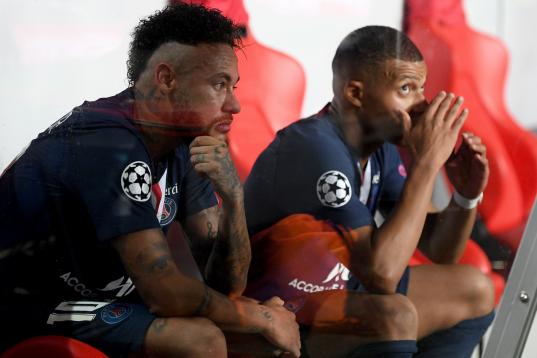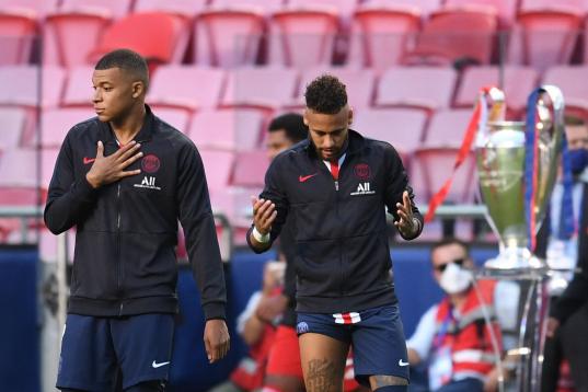 Paris Saint-Germain's French forward Kylian Mbappe (L) and Paris Saint-Germain's Brazilian forward Neymar concentrate prior to the UEFA Champions League final football match between Paris Saint-Germain and Bayern Munich at the Luz stadium in Lis...