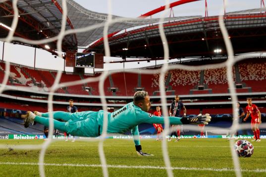 TOPSHOT - Paris Saint-Germain's Costa Rican Keylor Navas stops the ball shot by Bayern Munich's Polish forward Robert Lewandowski during the UEFA Champions League final football match between Paris Saint-Germain and Bayern Munich at the Luz stad...