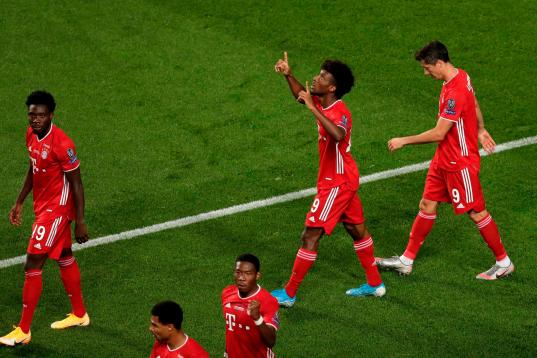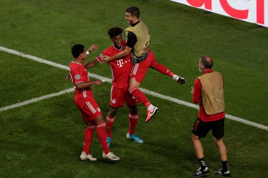 Bayern Munich's French forward Kingsley Coman (C) celebrates after opening the scoring during the UEFA Champions League final football match between Paris Saint-Germain and Bayern Munich at the Luz stadium in Lisbon on August 23, 2020. (Photo by...