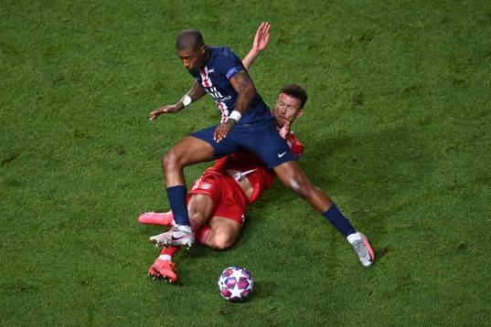 LISBON, PORTUGAL - AUGUST 23: Ivan Perisic of FC Bayern Munich tackles Presnel Kimpembe of Paris Saint-Germain during the UEFA Champions League Final match between Paris Saint-Germain and Bayern Munich at Estadio do Sport Lisboa e Benfica on Aug...