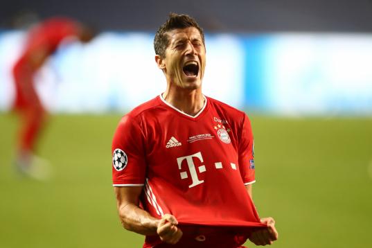 LISBON, PORTUGAL - AUGUST 23: Robert Lewandowski of FC Bayern Munich celebrates following his team's victory in the UEFA Champions League Final match between Paris Saint-Germain and Bayern Munich at Estadio do Sport Lisboa e Benfica on August 23...