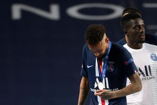Paris Saint-Germain's Brazilian forward Neymar receives his medal after the UEFA Champions League final football match between Paris Saint-Germain and Bayern Munich at the Luz stadium in Lisbon on August 23, 2020. (Photo by LLUIS GENE / POOL / A...