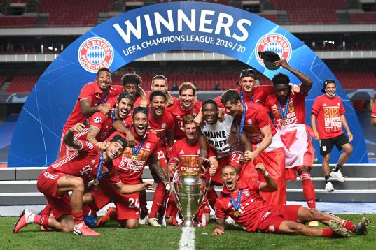 Bayern Munich players celebrate with the trophy after the UEFA Champions League final football match between Paris Saint-Germain and Bayern Munich at the Luz stadium in Lisbon on August 23, 2020. (Photo by Miguel A. Lopes / POOL / AFP) (Photo by...