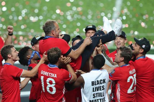 Bayern Munich's German coach Hans-Dieter Flick is thrown in the air after the UEFA Champions League final football match between Paris Saint-Germain and Bayern Munich at the Luz stadium in Lisbon on August 23, 2020. (Photo by Miguel A. Lopes / P...