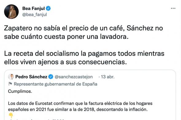 A esto ha respondido Fanjul mencionando al expresidente José Luis Rodríguez Zapatero: “Zapatero no sabía el precio de un café, Sánchez no sabe cuánto cuesta poner una lavadora. La receta del socialismo la pagamos todos mientras ellos viven ajenos a sus consecuencias”. El mensaje de la diputada del PP lleva desde su publicación 221 ‘me gusta’.