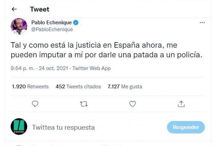 Tras todo ello, Echenique ha publicado un muy comentado tuit en el que asegura, irónico: “Tal y como está la justicia en España ahora, me pueden imputar a mí por darle una patada a un policía”.