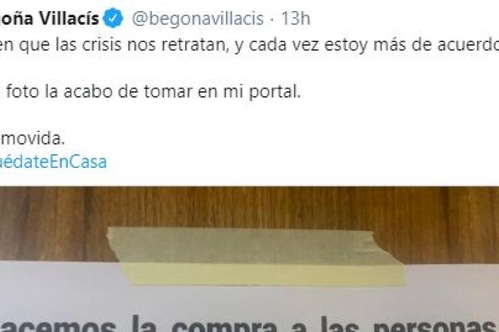 Begoña Villacís, la vicealcaldesa de Madrid y política de Ciudadanos, compartió este jueves el cartel que encontró en su portal. En él se ofrece ayuda: “Hacemos la compra a personas que no puedan salir a la calle. Avisadnos e iremos por las mañanas. Sin ánimo de lucro. Los vecinos del 4ºB”.