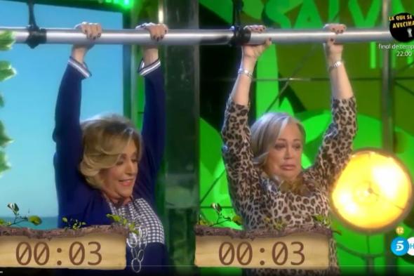 Esteban y Lydia Lozano competían a modo de humor en un ejercicio de resistencia colgadas de una especie de barra metálica en movimiento. A los pocos segundos, la colaboradora se ha soltado y ha caído al suelo con significativos gestos de dolor.
