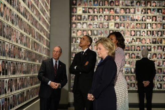 President Barack Obama, former New York Mayor Michael Bloomberg, first lady Michelle Obama, former Secretary of State Hillary Clinton and former President Bill Clinton tour the National September 11 Memorial & Museum on May 15, 2014 in New York....