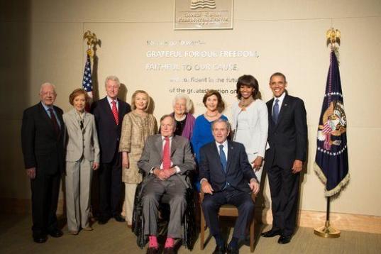 In this handout provided by the George W. Bush Presidential Center, former U.S. presidents Jimmy Carter, Bill Clinton, George H.W. Bush, George W. Bush and President Barack Obama and former first ladies Rosalyn Carter, Hillary Clinton, Barbara B...