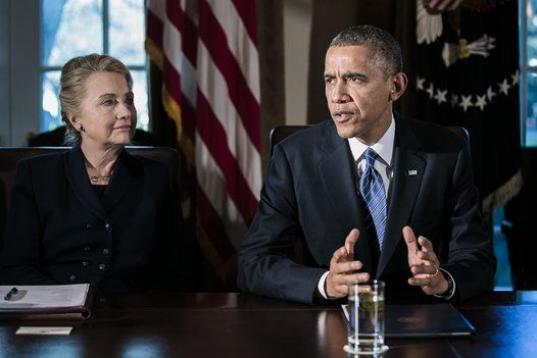 Hillary Clinton, then secretary of state, listens while President Barack Obama speaks during a cabinet meeting at the White House in Washington, D.C., U.S., on Wednesday, Nov. 28, 2012. (Photographer: T.J. Kirkpatrick/Bloomberg via Getty Images)