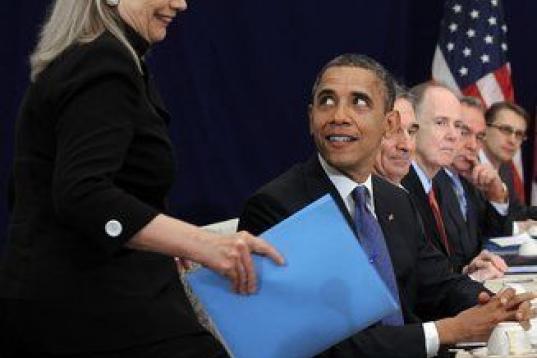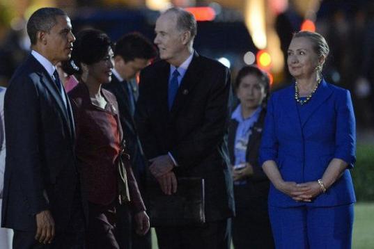 President Barack Obama looks at then-Secretary of State Hillary Clinton as she joins a bilateral meeting with Japanese Prime Minister Yoshihiko Noda (not pictured) on the sidelines of the East Asian Summit at the Peace Palace in Phnom Penh on No...