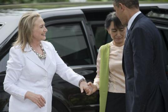 Then-Secretary of State Hillary Clinton and President Barack Obama are greeted by Myanmar pro-democracy leader Aung San Suu Kyi at her residence in Yangon on November 19, 2012. (NICOLAS ASFOURI/AFP/Getty Images)