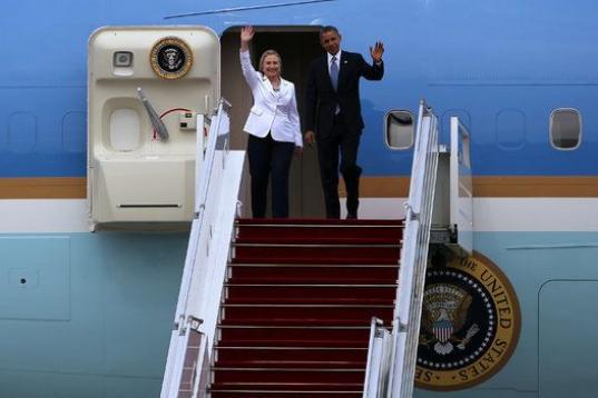 President Barack Obama and Hillary Clinton, then secretary of state, wave as they arrive at Yangon International Airport in Yangon, Myanmar, on Monday, Nov. 19, 2012. (Photographer: Dario Pignatelli/Bloomberg via Getty Images)
