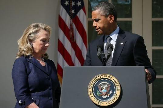 President Barack Obama makes a statement in response to the attack at the U.S. Consulate in Libya as then-Secretary of State Hillary Clinton looks on September 12, 2012 at the Rose Garden of the White House in Washington, D.C. (Photo by Alex Won...