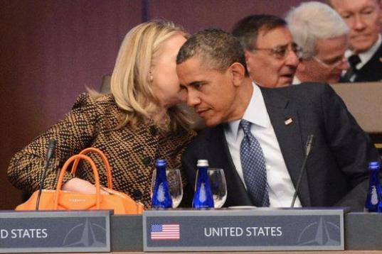 President Barack Obama listens to then-Secretary of State Hillary Clinton during the NATO summit at McCormick Place on May 20, 2012 in Chicago, Illinois.