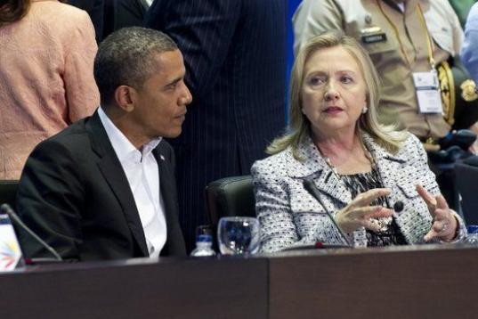 President Barack Obama and then-Secretary of State Hillary Clinton attend a Plenary Session for the VI Americas Summit at the Julio Cesar Turbay Ayala Convention Center in Cartagena, Colombia, April 14, 2012. (SAUL LOEB/AFP/Getty Images)
