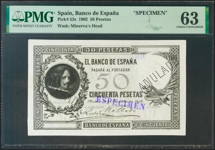 El billete no cuenta con la firma del cajero y aparece la marca Especimen en el centro. Lo reconocerás por la imagen de Velázquez en el dorso izquierdo. Estas peculiaridades hacen que aumente su precio.