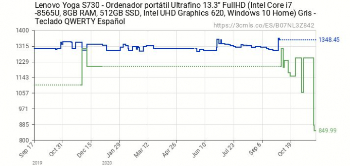 Como ejemplo, se ha comprobado si este ordenador portátil de Lenovo está realmente rebajado o no. Esta herramienta muestra este gráfico con la evolución del precio, que efectivamente ha tenido sus precios más reducidos durante este Black Friday.