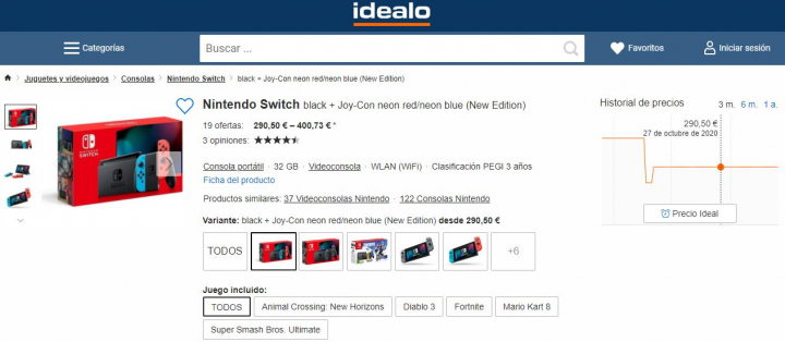 Como ejemplo, se ha comprobado cuáles son los precios de una consola Nintendo Switch. La herramienta muestra que varía entre los 290 euros y los 400 euros, incluyendo los enlace en la parte inferior a las diferentes páginas.
