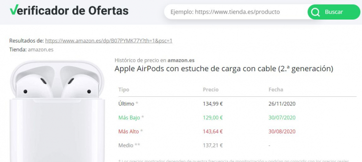 Como ejemplo, se ha introducido unos AirPods, los auriculares inalámbricos para los teléfonos de Apple, de Amazon. La página permite ver que este producto tuvo un mejor precio el pasado 30 de junio y que, por tanto, no es buena idea comprarlo este Black Friday.