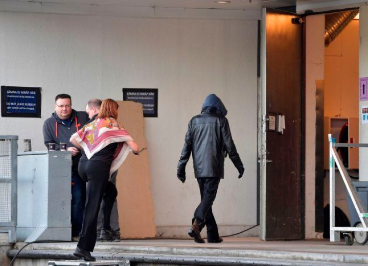 La agencia AFP ha distribuido esta imagen, en la que vemos a un hombre con una chaqueta de cuero, pantalones negros, botas y capucha azul, entrando en el Stockholm Waterfront, un centro de congresos de la capital sueca.