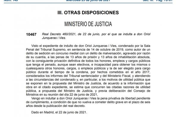 Los indultos ya se han hecho efectivos. El Boletín Oficial del Estado (BOE) publica este miércoles los nueve reales decretos del Ministerio de Justicia, aprobados por el Gobierno, por los que se conmutan parcialmente las penas de prisión a los 9 presos independentistas del procés, condenados por sedición y malversación.