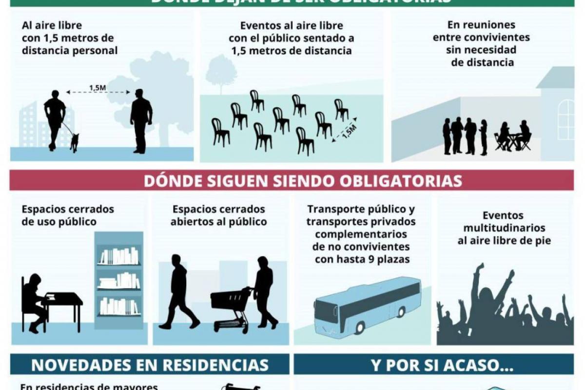 Se mantiene la obligatoriedad del uso de la mascarilla al aire libre cuando se produzcan aglomeraciones y no se pueda mantener una distancia mínima de 1,5 metros de distancia entre personas, salvo grupos de convivientes.