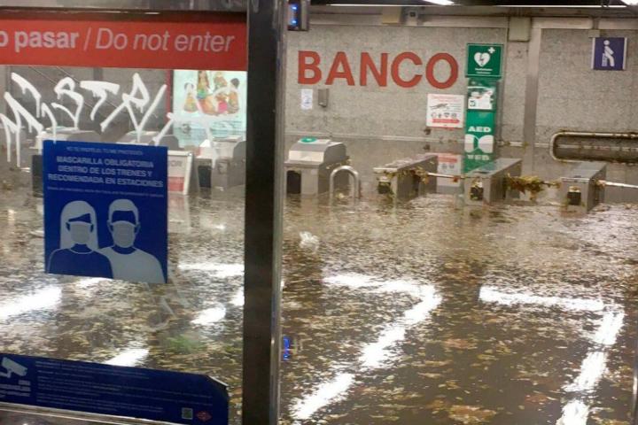 En la estación de Banco de España, situada en la calle de Alcalá, es donde más se han notado los efectos de la borrasca Efraín ya que la intensa lluvia se ha colado con fuerza hasta el vestíbulo dejándolo completamente anegado, según muestran diversos vídeos captados por ciudadanos y que circulan por redes sociales en los que se ve cómo el agua discurre como si fuera una cascada por las escaleras de entrada y convierte en una piscina los interiores.