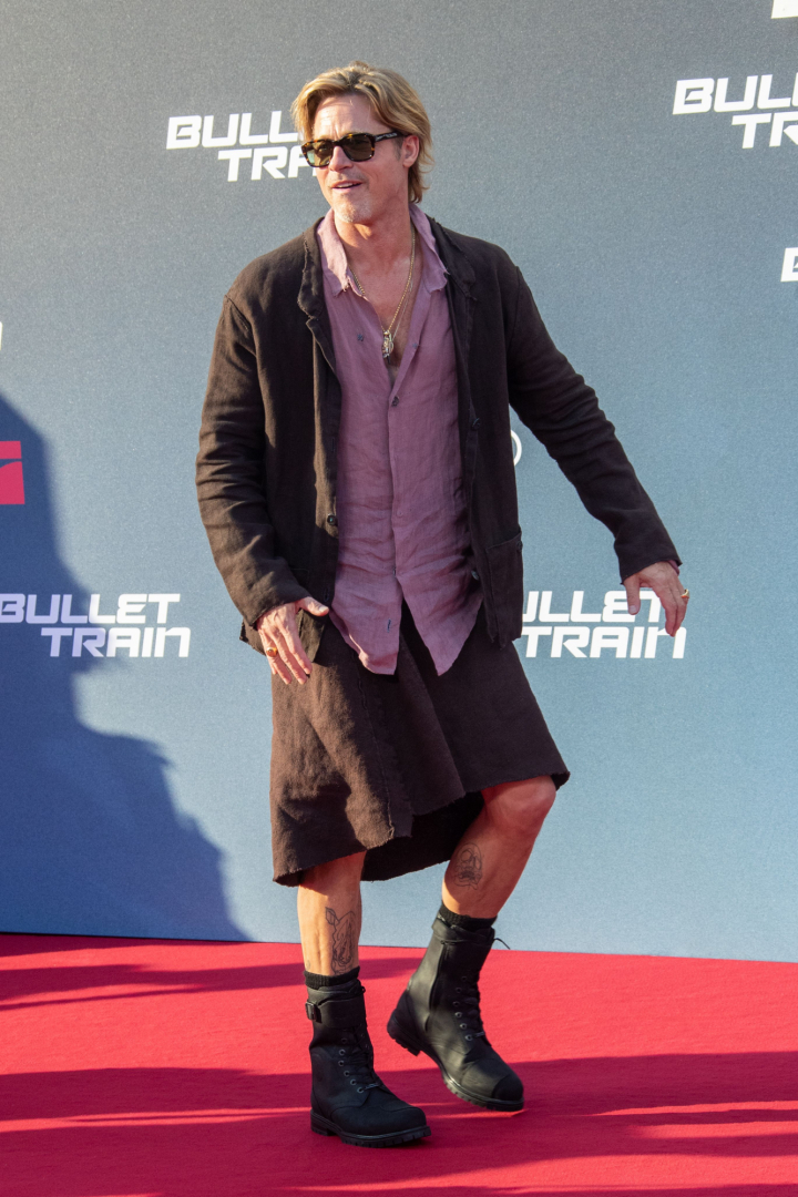 Brad Pitt ha huido de los convencionalismos y este lunes, en el estreno de su última cinta, Bullet Train, en Berlín, prescindió de los pantalones y, en su lugar, llevó una falda hasta la rodilla.