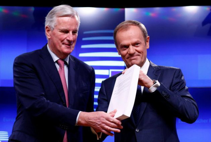Barnier y Tusk con una copia del acuerdo del Brexit.Reuters