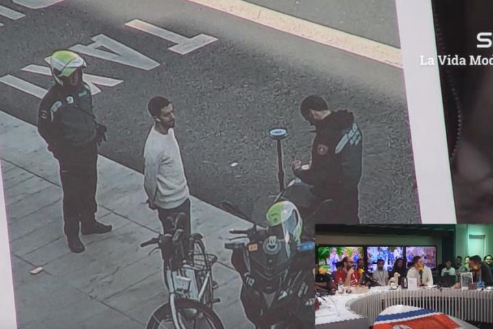 Entre risas, Queque ha mostrado en cámara la imagen que ha generado miles de comentarios en redes sociales: se ve a Broncano, con las manos en la espalda, rodeado por dos policías junto al vehículo con el que cometió la infracción: una bicicleta blanca de BiciMad.