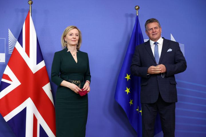 La ministra de Exteriores británica, Liz Truss, y al vicepresidente de la Comisión Europea encargado de supervisar las relaciones con Reino Unido, Maros Sefcovic.Anadolu Agency via Getty Images