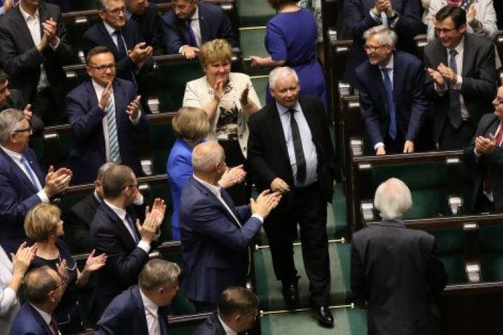 Jaroslaw Kaczynski, líder del partido Ley (o Derecho) y Justicia, aplaudido en el Parlamento por sus compañeros tras ganar la votación.Agencja Gazeta / Slawomir Kaminski / REUTERS