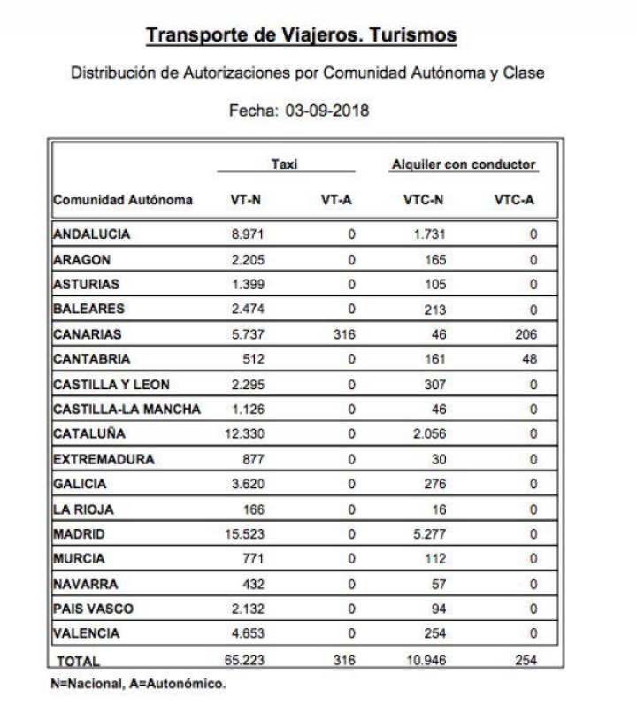 Estas son las cifras de licencias de VTC y de taxi por provincia: