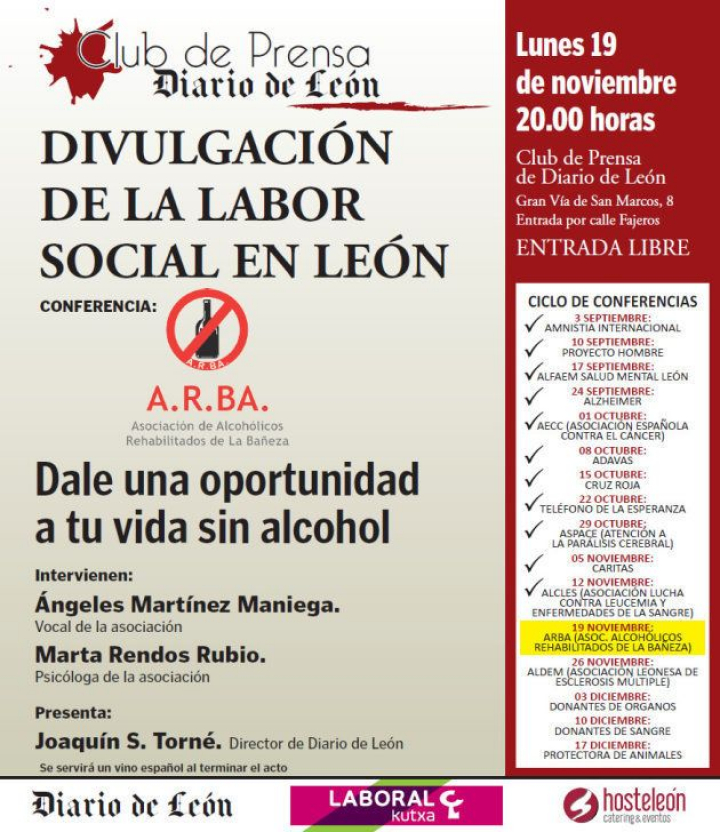 El Diario de León ha generado un considerable cachondeo en Twitter con el cartel con el que su club de prensa ha promocionado una conferencia de la Asociación de Alcohólicos Rehabilitados de La Bañeza (ARBA) titulada Dale una oportunidad a tu vida sin alcohol.