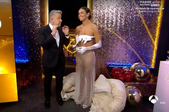 Y de nuevo, con el mismo formato estilístico: Chicote, sobrio, con traje; Pedroche, con su tradicional y polémico vestido.