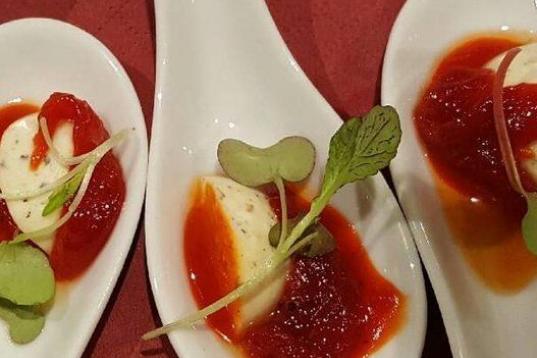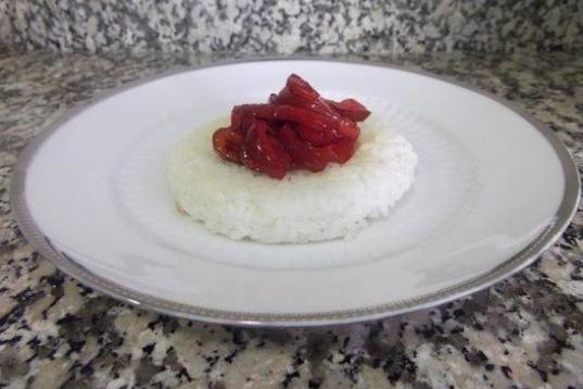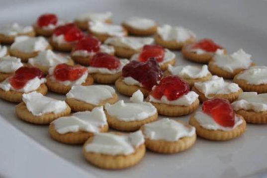 El blanco lo aporta el queso de untar y el rojo es por la mermelada de fresa. También se puede hacer con mermelada de tomate. En Cookpad puedes ver la receta.