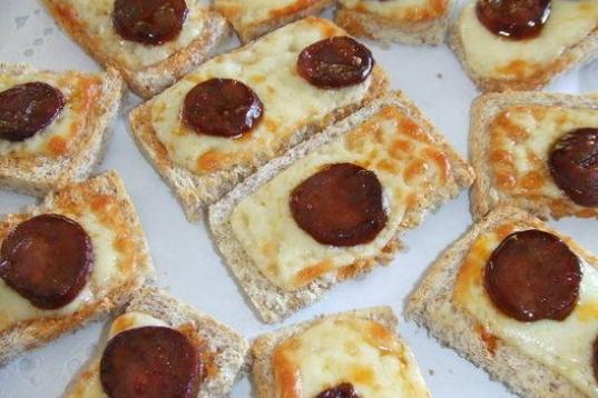 En cuestión de embutidos el más atlético es el chorizo, sin duda. Unas tostas con queso serán un pincho colchonero perfecto. Los no amantes de los lácteos pueden eliminarlo y utilizar la miga de pan para darle el toque blanco al plato.