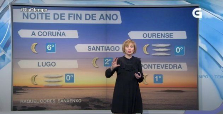 Día 31 de diciembre. Hora del informativo del mediodía en la televisión gallega (TVG). El informativo cuenta la previsión del tiempo para el día de Año Nuevo, primer día del 2019.