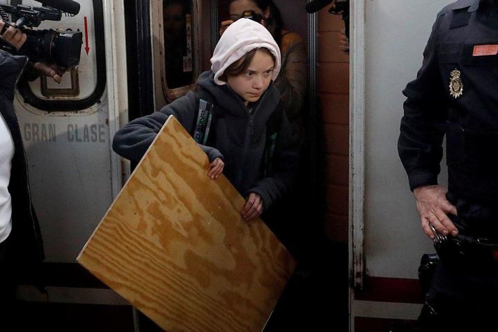 La activista sueca se bajó del tren con un objeto de gran tamaño.