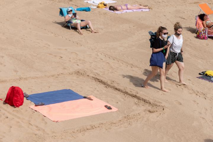 Justamente paseando por la orilla pudimos constatar que las personas o grupos que marcaban en la arena la distancia de seguridad, a pesar de que en las fotos de los periódicos o en los consejos de las autoridades los señalan dibujando un cuadrado, preferían trazar una circunferencia más o menos redonda para colocar en medio sombrillas y sillas, y eventualmente neveras.