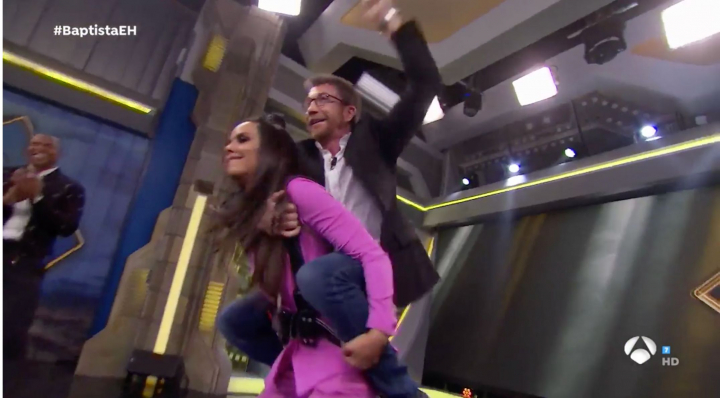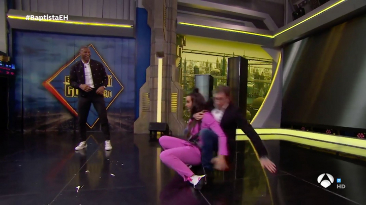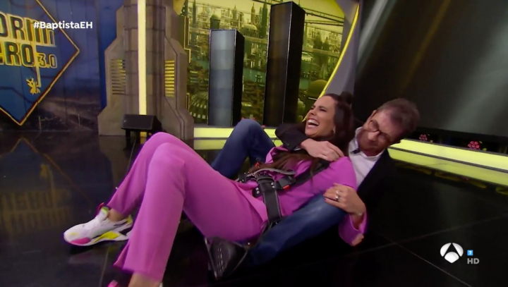 Este jueves lo hizo con el invento que presentó, una silla de montar para padres que llevaba puesta en la que trató de que se subiera el exfutbolista Baptista, invitado de la noche —el otro invitado, Roberto Carlos, no pudo acudir al estar el Real Madrid en cuarentena por el coronavirus—.