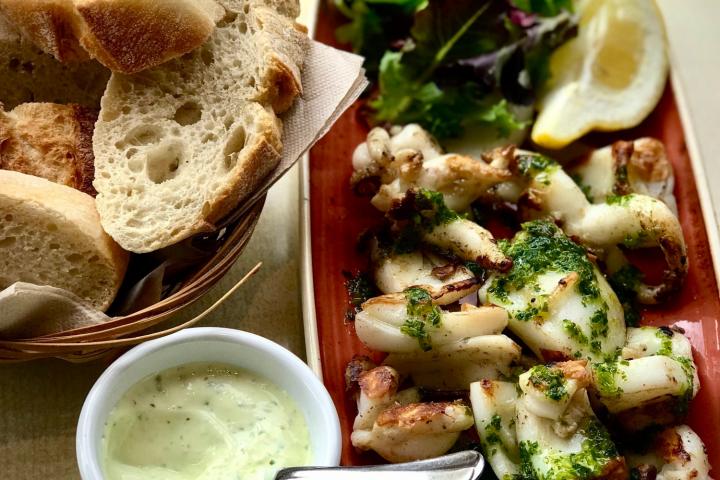 Calamares o sepia asados a la parrilla en cilantro, jengibre y ali oli